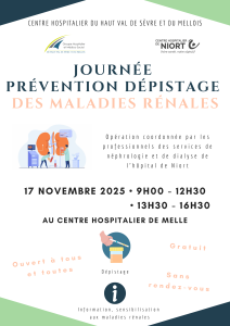 Opération de dépistage des maladies rénales coordonnée par les professionnels des services de néphrologie et de dialyse de l'hôpital de Niort. Le 17 novembre 2025 de 9H00 à 12H30 et de 13H30 à 16H30 au centre hospitalier de Melle. Ouvert à tous et toutes / Gratuit / Sans rendez-vous