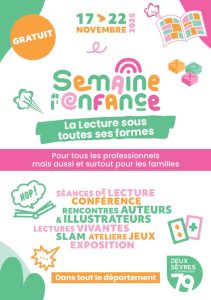 Le Département des Deux-Sèvres organise du 17 au 22 novembre 2025 la Semaine de l'enfance. Au programme : - Séances de lecture - Conférence - Rencontres auteurs et illustrateurs - Lectures vivantes - SLAM - Jeux - Exposition Dans tous le département. Retrouvez le programme : PROGRAMME_SEMAINE_ENFANCE_ 2025
