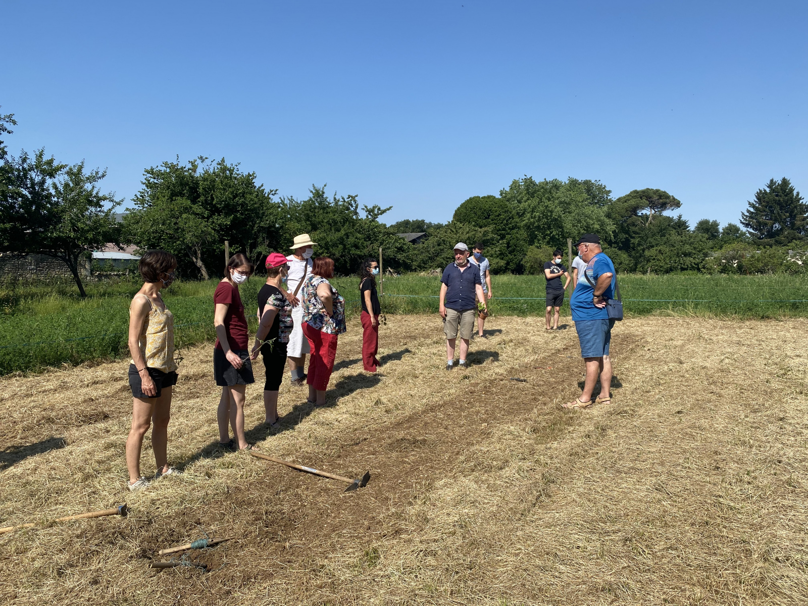 La théorie s’étant passée fort agréablement, assis en rond à l’ombre d’un beau cerisier, la pratique (plantation de plusieurs sortes de légumes) fut un peu plus « dure », la terre étant sèche et le soleil de 11h brûlant. On peut dire que toutes les conditions étaient parfaitement réunies pour découvrir et comprendre l’importance des méthodes préconisées par Franck pour anticiper la sècheresse. Et puis « c’est en jardinant, qu’on devient jardinier ». Ce fut une excellente matinée pour tous !