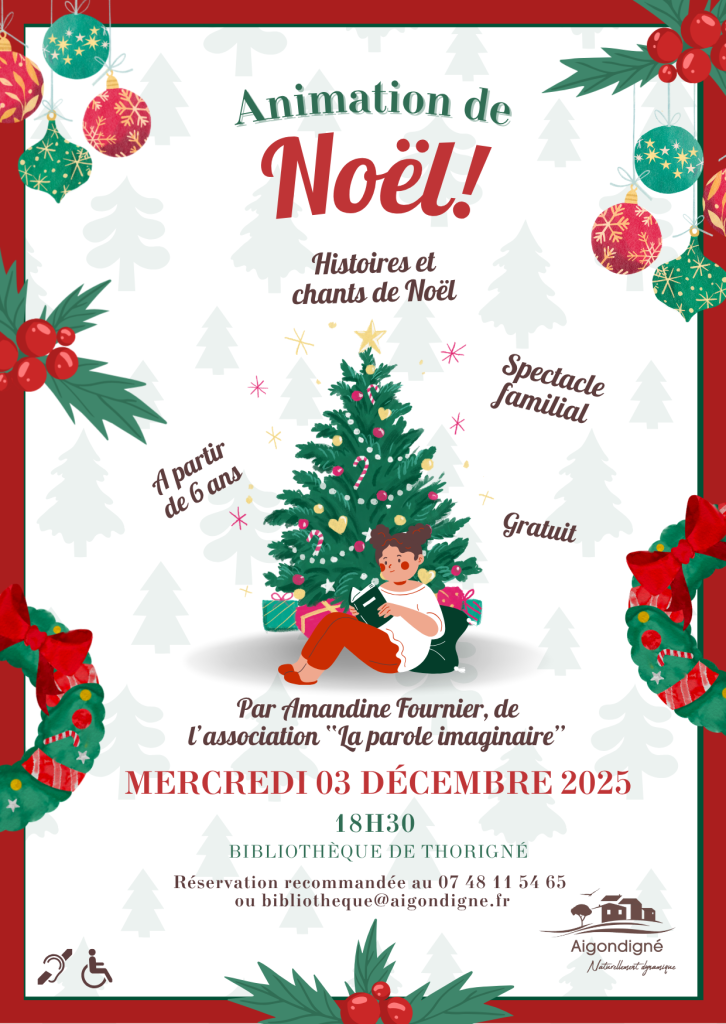 La bibliothèque d’Aigondigné vous invite à une animation de Noël le mercredi 3 décembre à 18h30 à la bibliothèque de Thorigné.