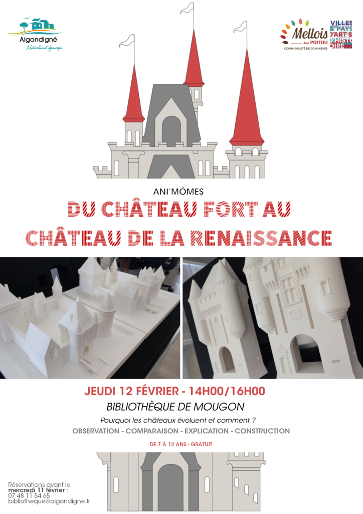 Rendez-vous le jeudi 12 février de 14h00 à 16h00 à la bibliothèque de Mougon pour un atelier « Du château fort au château de la Renaissance ».