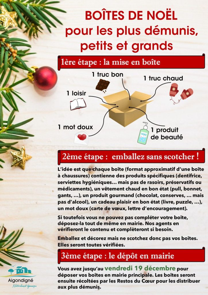 Le principe est simple : chaque habitant est invité à composer une boîte contenant un cadeau loisir (livre, puzzle, magazine,…), une douceur (chocolat, confiseries, …), un vêtement chaud en bon état (gants, écharpe, pull, …) et un produit d’hygiène (dentifrice, savon, serviettes hygiéniques,…). Afin que cette attention soit unique et personnalisée, il est demandé aux habitants d’y glisser un petit mot de réconfort et de bons vœux. Souvent, les petits Aigondignois y voient l’occasion de laisser parler leur créativité et de fabriquer eux-mêmes une carte. Ces boîtes, une fois pleines de cadeaux et de bienveillance, seront remises aux Restos du Cœur qui les distribueront ensuite aux bénéficiaires durant la période de Noël.