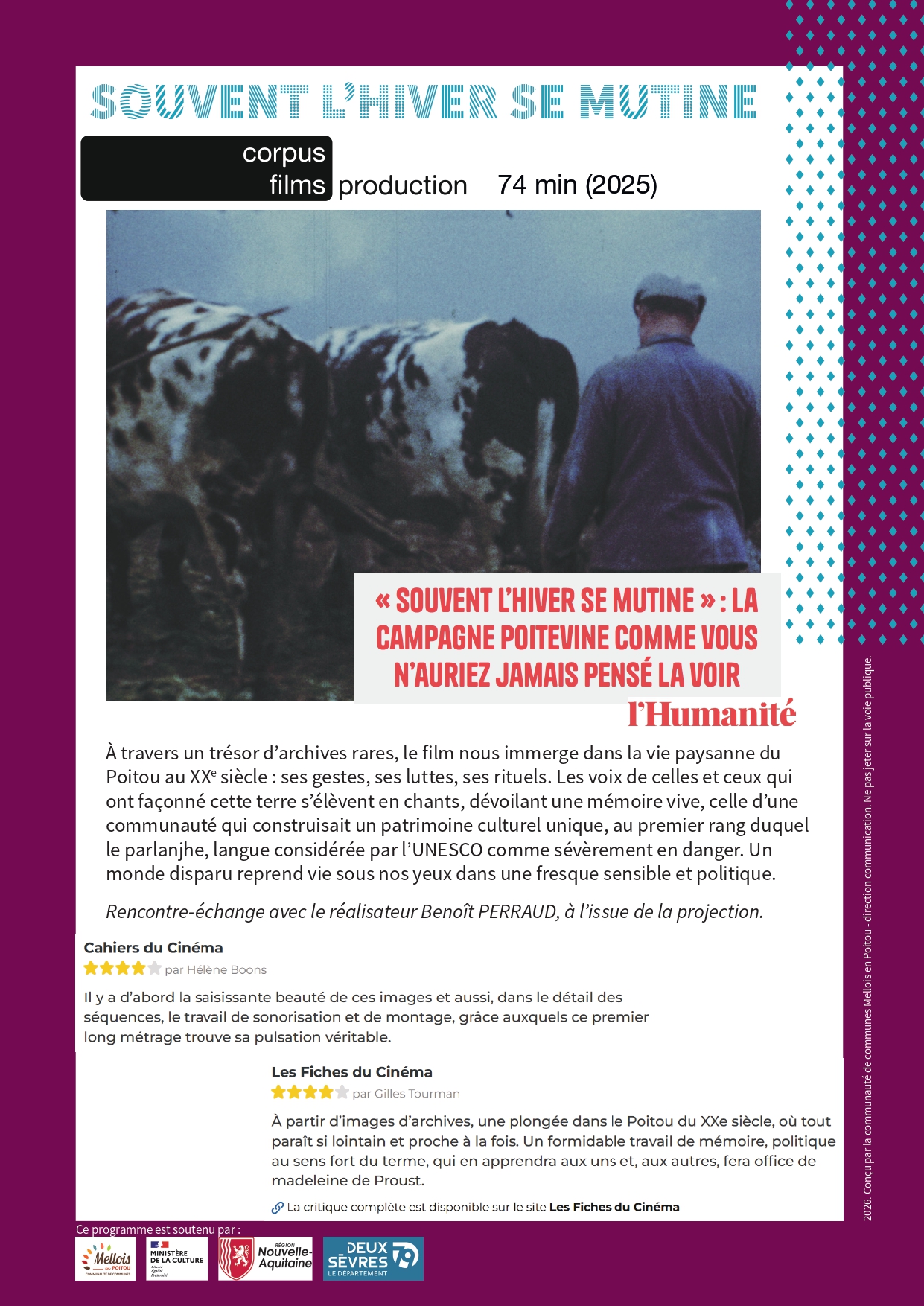 Benoit Perraud, le réalisateur de Souvent l’hiver se mutine (74 mn), sera présent pour évoquer son travail et répondre à vos questions.