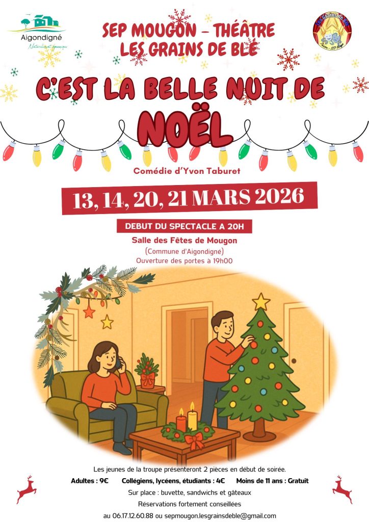 La troupe « Les Grains de Blé » est ravie de vous inviter à découvrir leur nouvelle pièce principale : « C’est la belle nuit de Noël », une comédie écrite par Yvon Taburet.