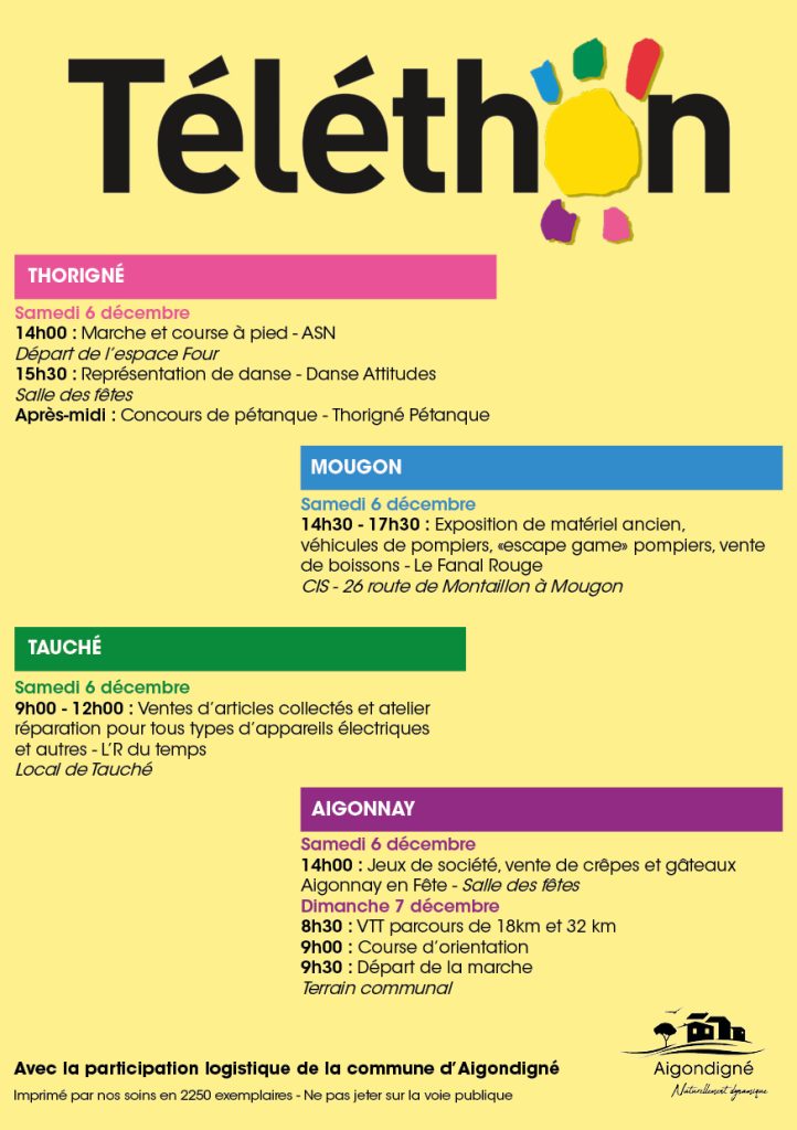 Tout le week-end, et sur chacune des communes déléguées, des animations vous seront proposées par les associations aigondignoises à l’occasion du Téléthon.