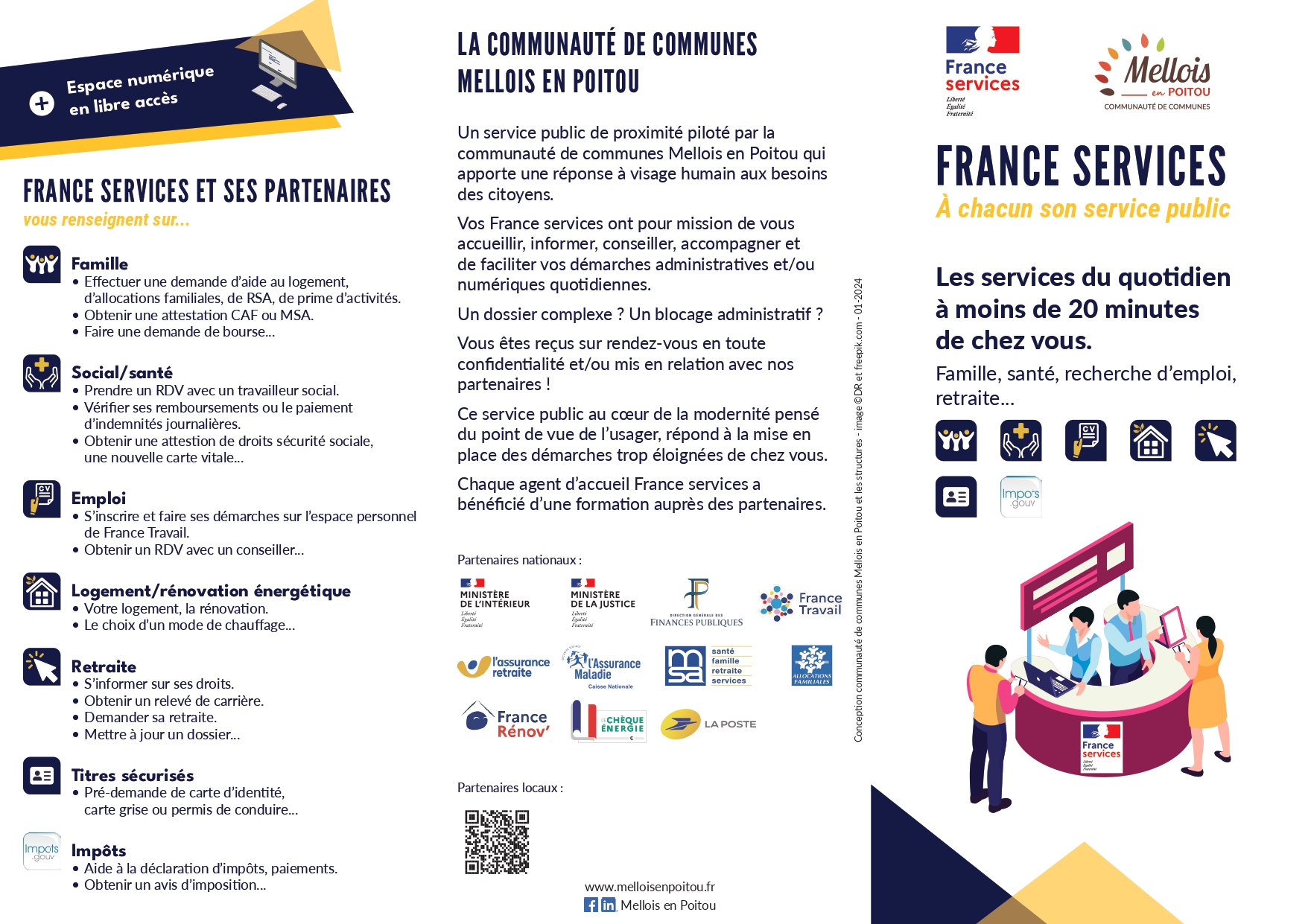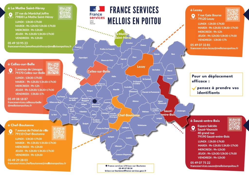 La communauté de communes Mellois en Poitou dispose de 5 France services réparties sur le Mellois : Chef-Boutonne, Celles-sur-Belle, la Mothe Saint-Héray, Lezay et Sauzé-entre-Bois.