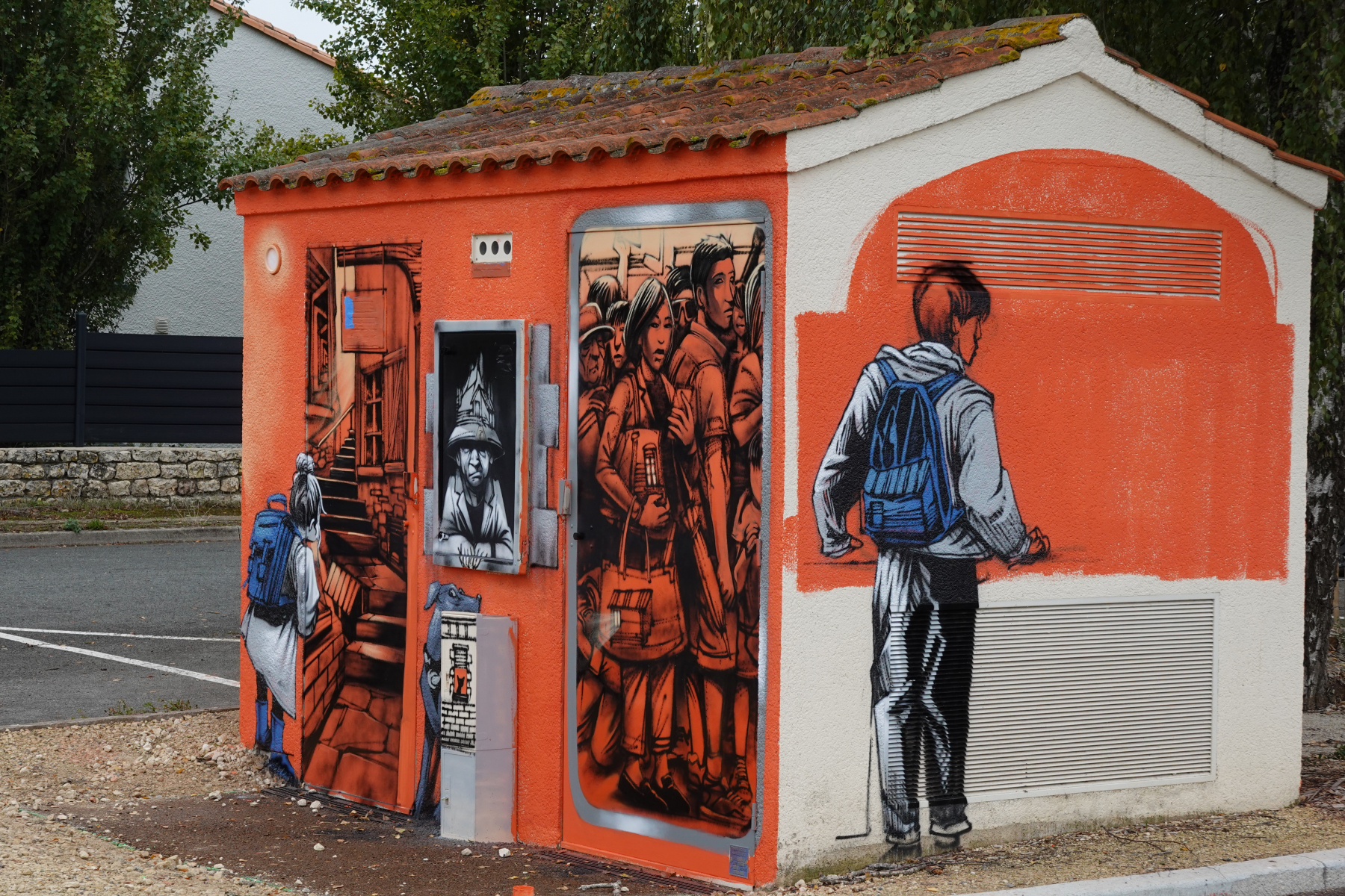 Cette semaine, le projet entre dans une nouvelle phase. De nouveaux artistes, tous représentés par KiGalerie, galerie d’art contemporain parisienne, seront à l’œuvre sur plusieurs sites. Armés de bombes de peinture et d’une créativité débordante ils habilleront les postes électriques de la commune. Chacun apportera son style, ses couleurs et ses messages, offrant une nouvelle identité visuelle aux rues aigondignoises.